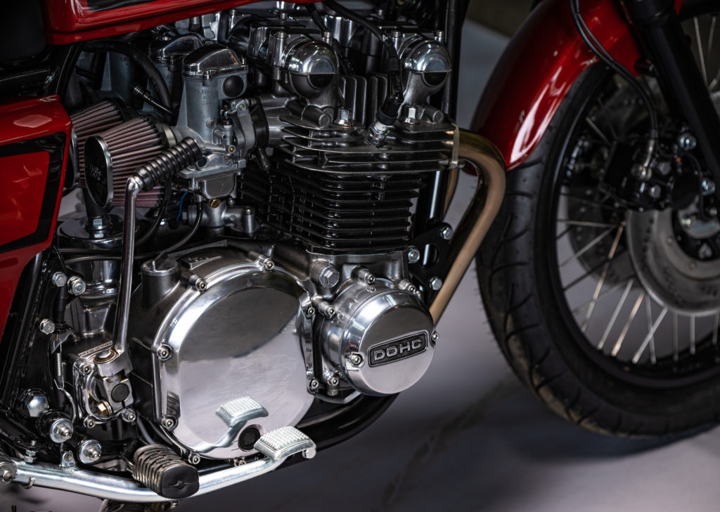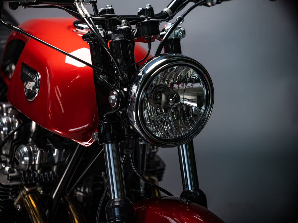 Once the fabrication was finished and the lines of the bike were to Sean’s liking, he dove into disassembly. All of the parts that would be black were cleaned up and taken to Right-a-Way Powder to have that gloss black applied. The body work was given to Danny at Knights Kustoms. Bob, the owner of the Kawasaki, had chosen to paint the bodywork Ford Raptor Red. It’s a beautiful color that showcases the classic look of the bike. Since everything was out getting shined up, Sean got started on the engine rebuild. The top end got removed for inspection, turned out that everything was well taken care off. New pistons and rings were installed and the cylinder got honed. All new gaskets and seals were used and fresh paint was applied to finish it off. Browning Polishing added a bright new shine to all of the engine covers and new stainless hardware fastened everything down.