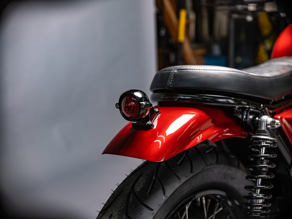 Since this build was to look similar to the 1979 Kawasaki the Virginia based outfit already built before, the new project really didn’t need to much designing. Bob shipped a Royal Enfield Continental GT gas tank to Motorelic and Sean got to work cutting it up to fit the KZ frame. The tanks outside dimensions fit the bike very well. The tunnel, not so much. It requires a completely new tunnel to fit the KZ’s frame; the frame needed new mounting points. Once the tank was fitted and had the right clearance to the forks, the seat could be built. The new seat needed to be able to lift up using the stock lock and modified hinges. It received a new black leather cover, upholstered by Counterbalance Cycles. The subframe needed to have a cafe style loop welded in to finish off the look and help hold the custom rear fender which houses a Motone tail light.