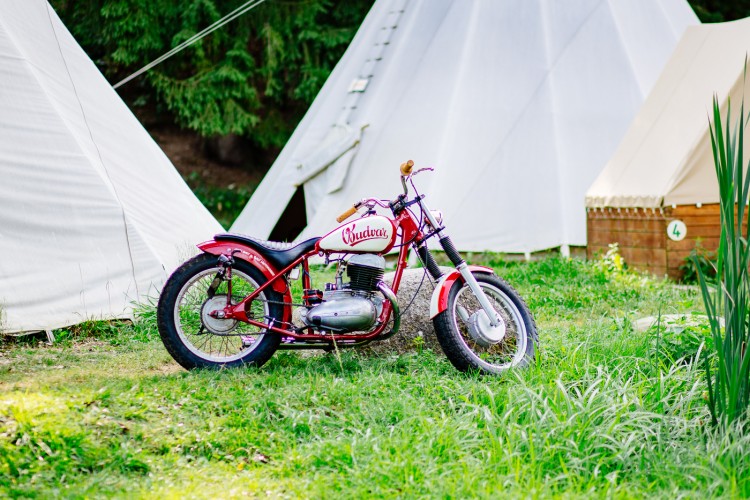 Back on the Budvar Bike, Andrew and the team set off on the 90-mile ride into South Bohemia, crossing into beautiful rolling fields and mountain scenery, reaching the stunning UNESCO World Heritage site of Český Krumlov. The JAWA museum in the town had provided inspiration for the Budvar Bike build so it seemed only right to return to show the curators the finished motorcycle. Then the team rode through winding forest roads to spend the night in a tipi and swim in the cool Vltava river, before sharing some beers and stories around a campfire.